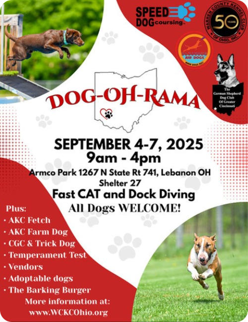 While Summer is simmering on, Fall is fast on its heels. And with it comes our annual Dog-OH-Rama event on Thursday, September 4th through the 7th, 2025. This is a fun fest of various performance events all balled up in one four-day extravaganza. This year’s event will return to Armco Park and include: Fast CAT Fetch Farm Dog Temperament Testing Canine Good Citizen Trick Dog And to keep us and our dogs all fueled for fun, we invited the Barking Burger food truck to cater to both two and four legged appetites. YOUR DOG DOES NOT HAVE TO BE REGISTERED PUREBRED TO PARTICIPATE! ALL dogs of any pedigree can participate in AKC sports and performance events, to include all of those offered at Dog-OH-Rama! If you want, your unregistered Dog can even earn official AKC titles and certifications, just like their registered purebred cousins. If you are interested in AKC recognition, there are three pathways to achieving credits from Dog-OH-Rama: If your dog is already an AKC registered purebred, simply apply their registration number to all event entries. If your dog is purebred but registered with another registry or is not registered at all, you can obtain a Purebred Alternative Listing (PAL) number. [Click Here] for more information and to register .If your dog is a mixed breed, you can enroll your dog in the AKC Canine Partners™ Program. [Click Here] for more information and to enroll. No matter what, ALL dogs are invited to participate in and have a great time at Dog-OH-Rama! So, if you aren’t too worn out from grilling over Labor Day, come spend the next weekend with us for plenty of canine fun and frivolity. [CLICK HERE] for more information.